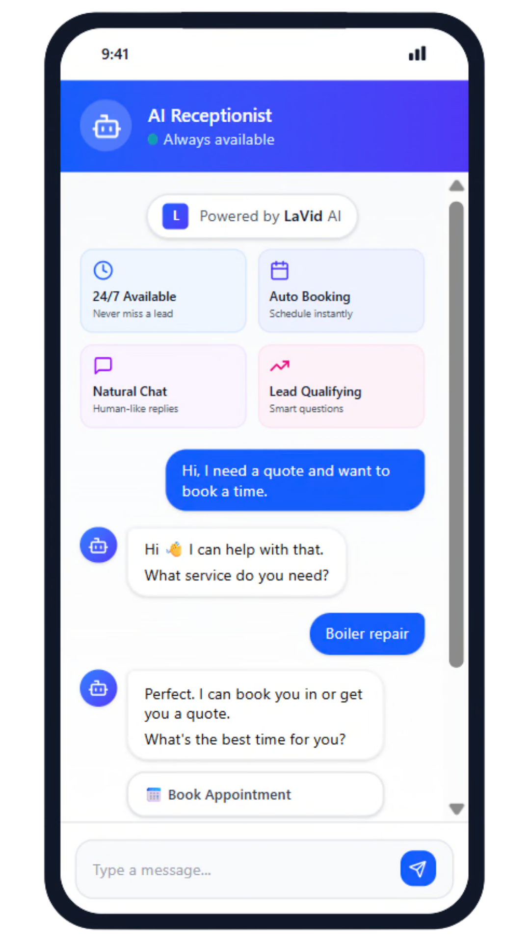 LaVid's AI receptionist answers questions, qualifies leads, and books appointments 24/7—so you can focus on running your business.