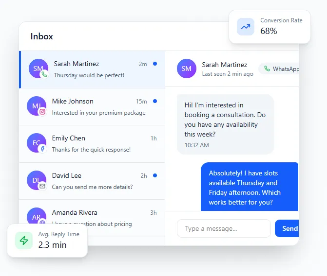 Manage SMS, WhatsApp, social DMs, email, and website chat from one simple dashboard — never miss a lead again.