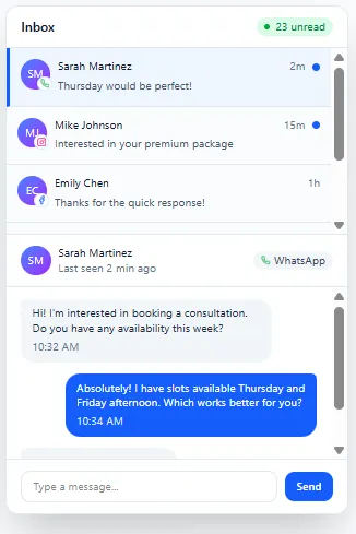 Manage SMS, WhatsApp, social DMs, email, and website chat from one simple dashboard — never miss a lead again