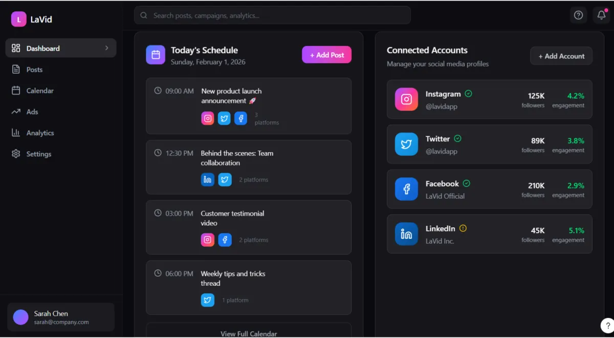 See post engagement, reach, and activity in real time. Use the data to refine your content and stay consistent without the manual work.